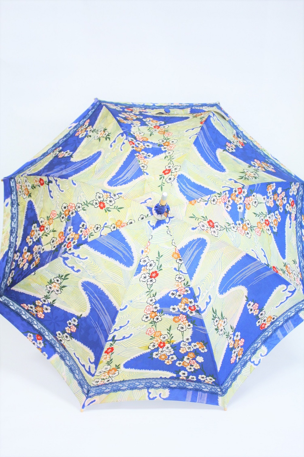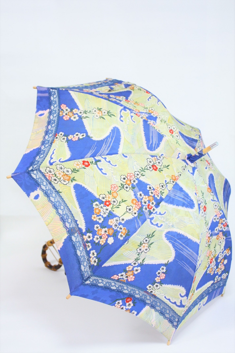 小紋の着物を日傘へリメイク-青色に小花-