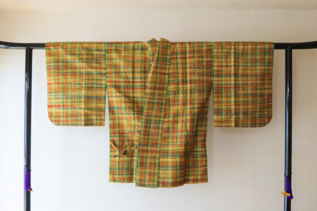紬の風合いがとってもよい、優しい山吹色や緑色の道中着をリメイクでご依頼頂きました