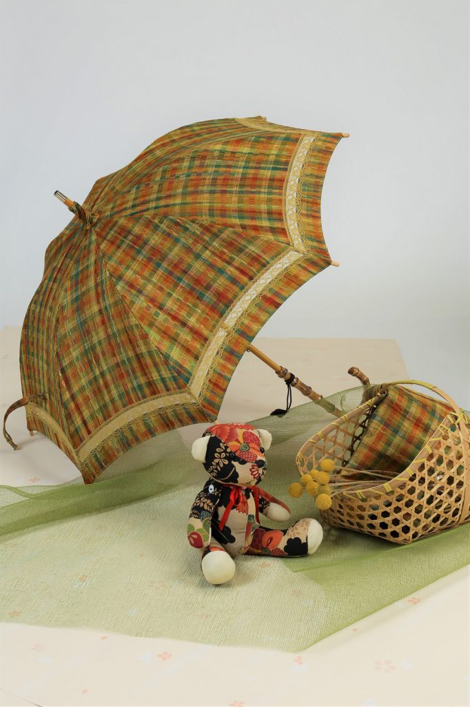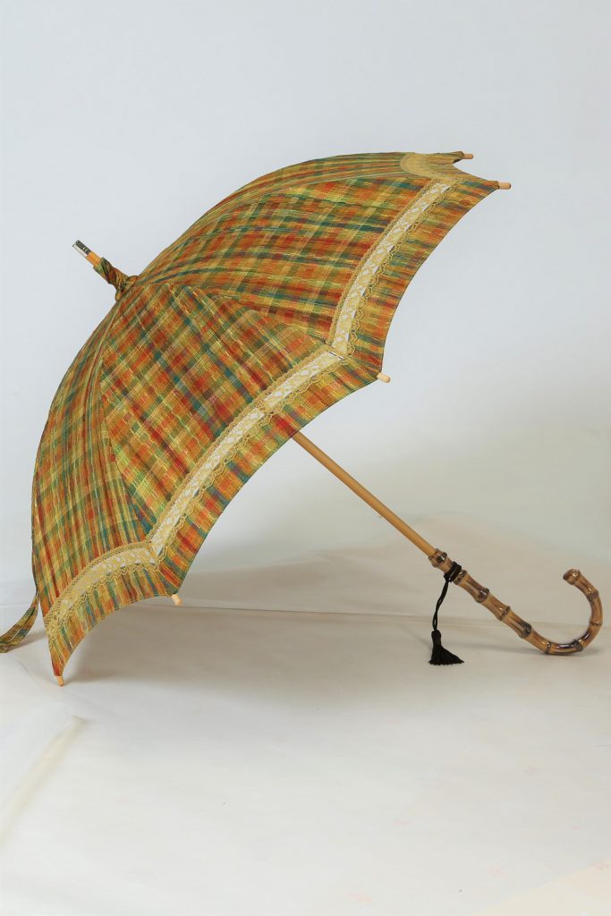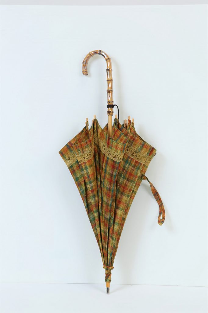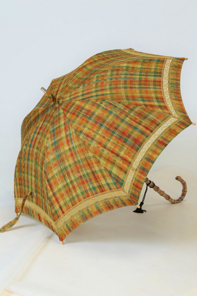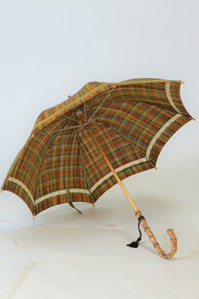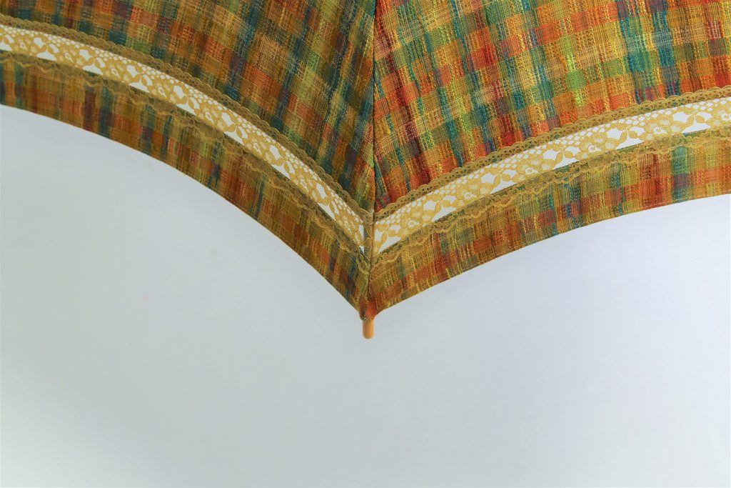 いかがでしたでしょうか。丈は腰くらいの短いコートでしたが、日傘にリメイクできてます。そして可愛いものになりました。格子柄なので、お若い方から年齢を重ねた方にも使いやすいですね。