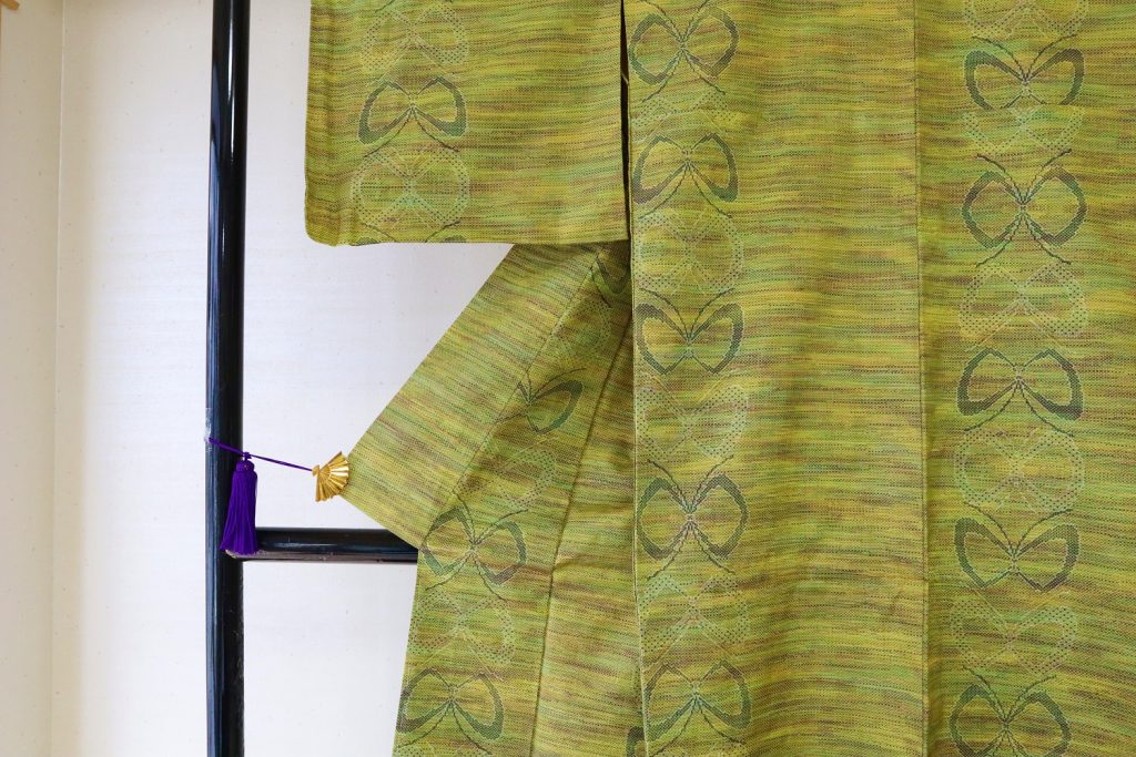 ご依頼頂きました、黄緑色の紬の着物。柄がまた素敵なんです!可愛い大人のお洒落な紬の着物です。