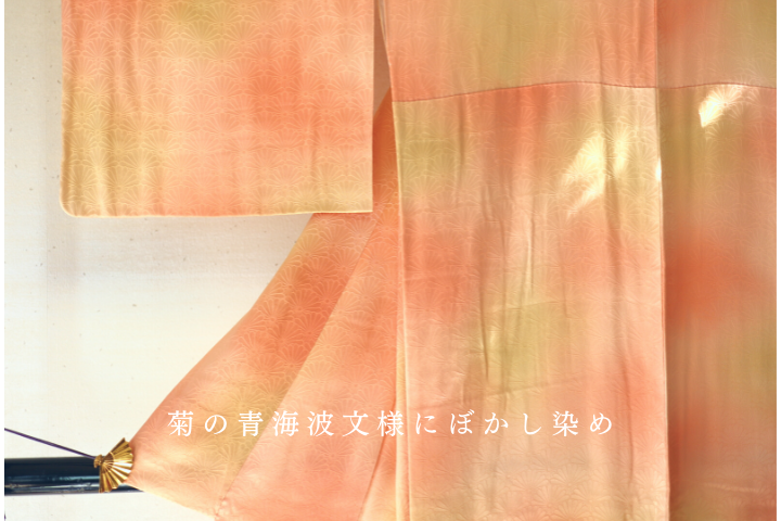 生地の地模様は菊を青海波のように配したモダンで華やか。程よい艶感や発色の良さは絹糸ならではの美しさがあります。