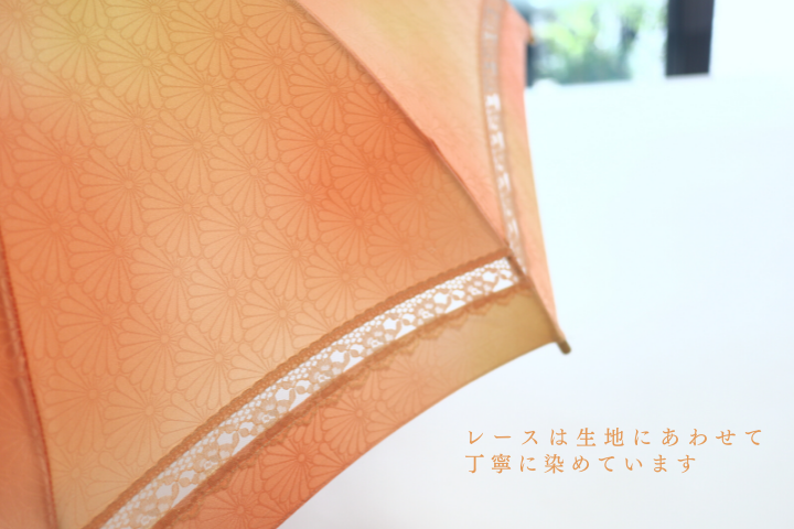 一つ一つレースは生地にあわせて染めています。繊細な色なので、薄い色からだんだん濃くして染めておられるそうで、いつもキレイなお色で日傘にする生地に寄り添う美しさです。