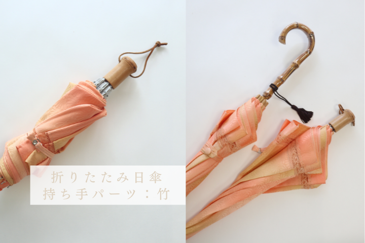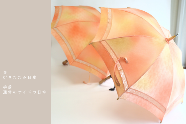 単体で写真が無くて申し訳ないのですが、奥の方が折り畳み日傘を広げたところです。折りたたみ日傘もレースを入れてお仕立できます。
