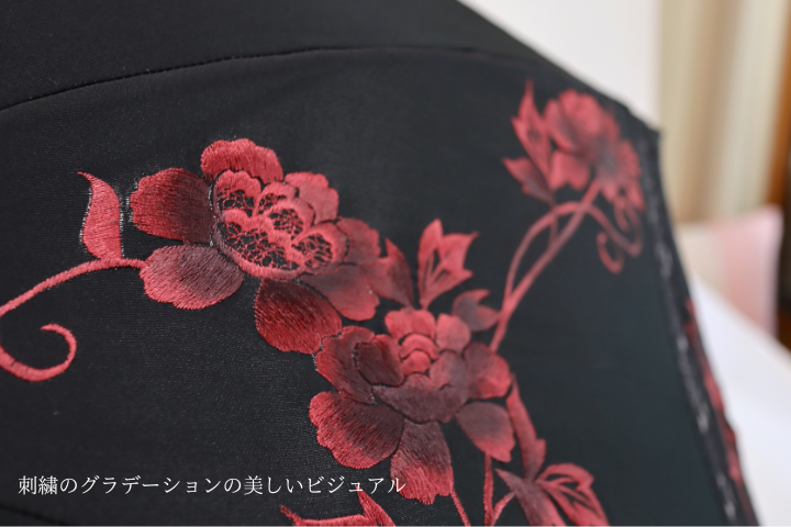 グラデーションがあって、糸の立体感が羽織の黒に浮き上がる美しい装飾です。