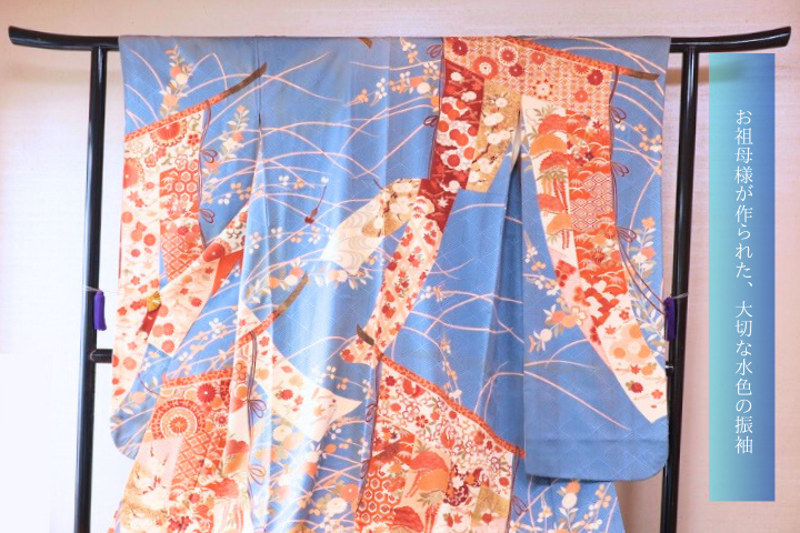 今回お預かりしたのは、爽やかで落ち着いた水色をベースに、吉祥文様が華やかに描かれた大変美しいお振袖です。 このお着物は、おばあ様が愛情を込めてあつらえられたもの。今回ご依頼いただいたお客様は三姉妹でいらっしゃいました。三姉妹の皆様、そして姪っ子様の計4名で、大切に着継がれてきたそうです。