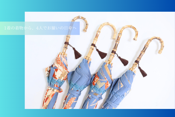 同じ1着のお着物から作られていても、柄の出方が1本1本少しずつ異なる、世界に一つだけの特別な4本の日傘です。着物のままでは一度に1人しか着られませんが、日傘に形を変えることで、ご家族みんなで同時に「お祖母様の愛情」を分かち合えるのが、リメイクの素晴らしいところです。