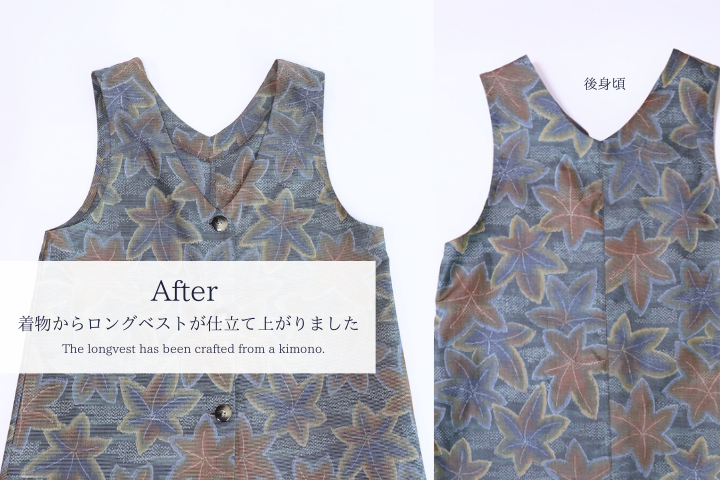 着物からお洋服へリメイクオーダー。気軽に着られるロングベスト(ジレ)にして、さっと羽織っておしゃれに素敵に身につけませんか。どなたにとってもできるだけ着やすくて着心地の良いユニバーサルデザインをセレクトしました。サンプルを店頭にご用意しておりますので、実際に羽織っていただいてサイズを体感ください。お着物を身近に、リメイクを気軽にオーダーいただけたらと思います。