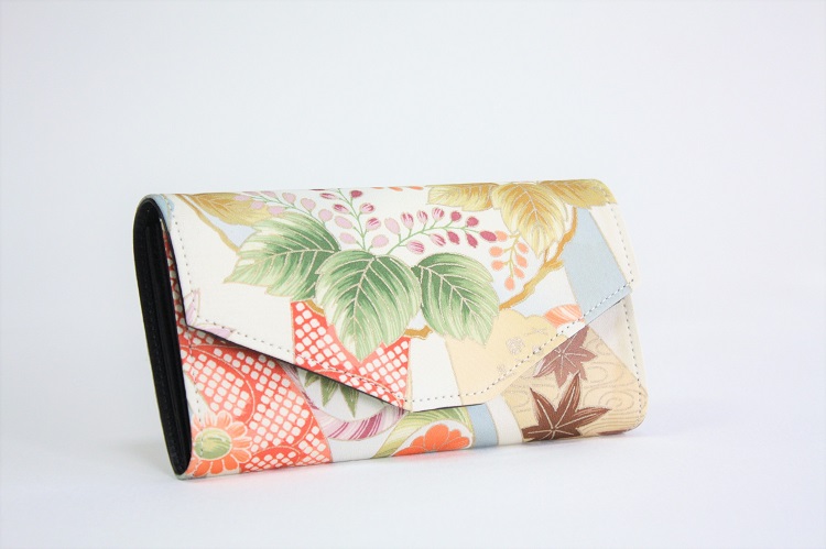 お札を折らない長財布。写真は振袖をリメイクしたので女性向けですが、大島紬などでリメイクすると男性にもお使い頂けるます。外側はシンプルなデザイン。