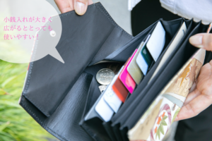 - 小銭入れが大きく広がるので、小銭を探す手間がありません。
